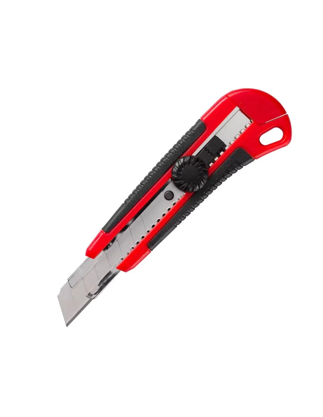 Diseño ergonómico con dos materiales que aseguran una excelente sujeción. Pulsador autobloqueo. Guía metálica. Esconde-cuchillas integrado. Permite guardar 2 cuchillas de reserva en el cuerpo del cúter.