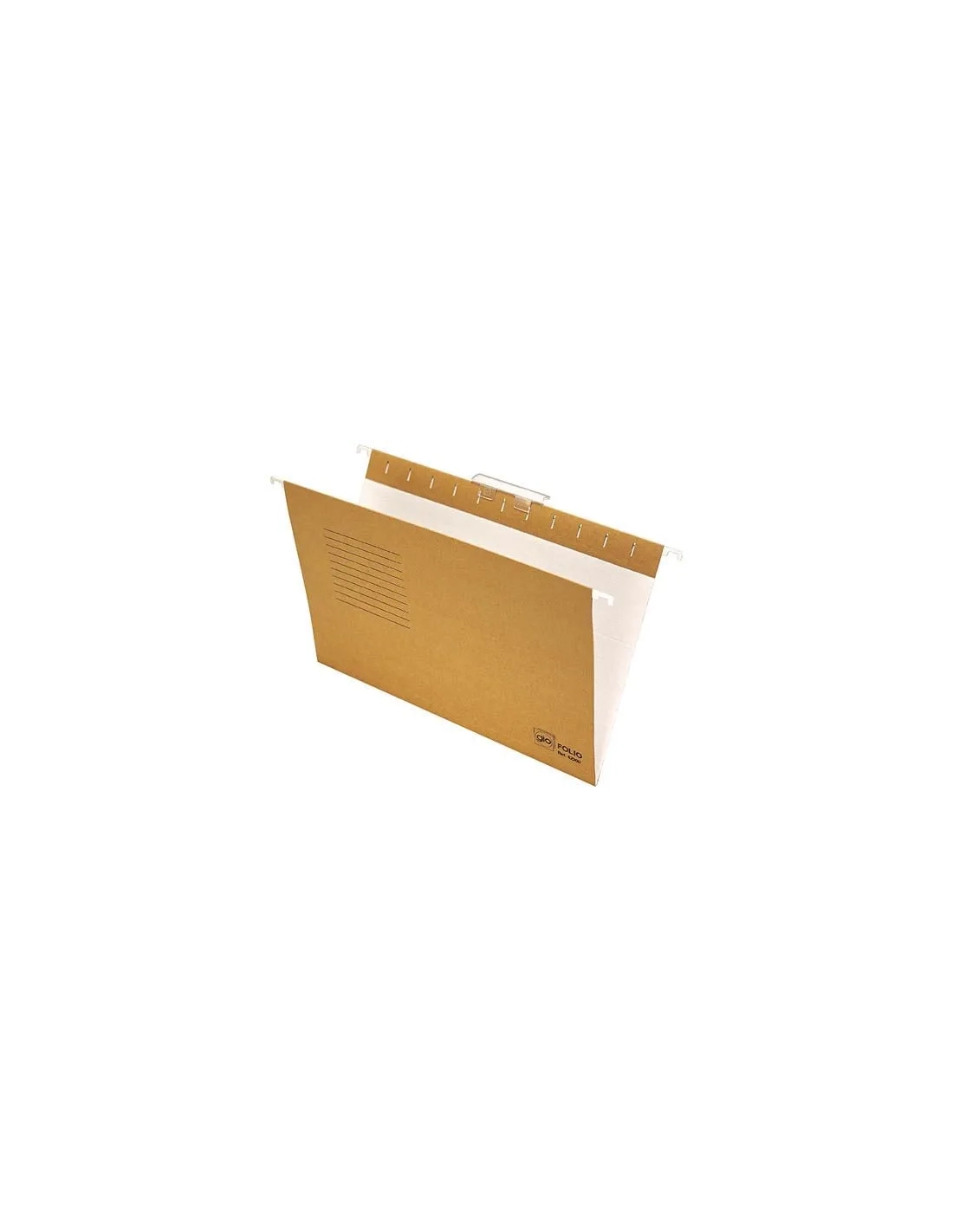 Carpeta colgante fabricada en kraft bicolor de 240 g. Formato Folio. Visor rígido superior corto de 8 cm. Varilla de acero. Lomo normal en V. Ancho entre guias 36,5 cm. Incluye etiquetas.