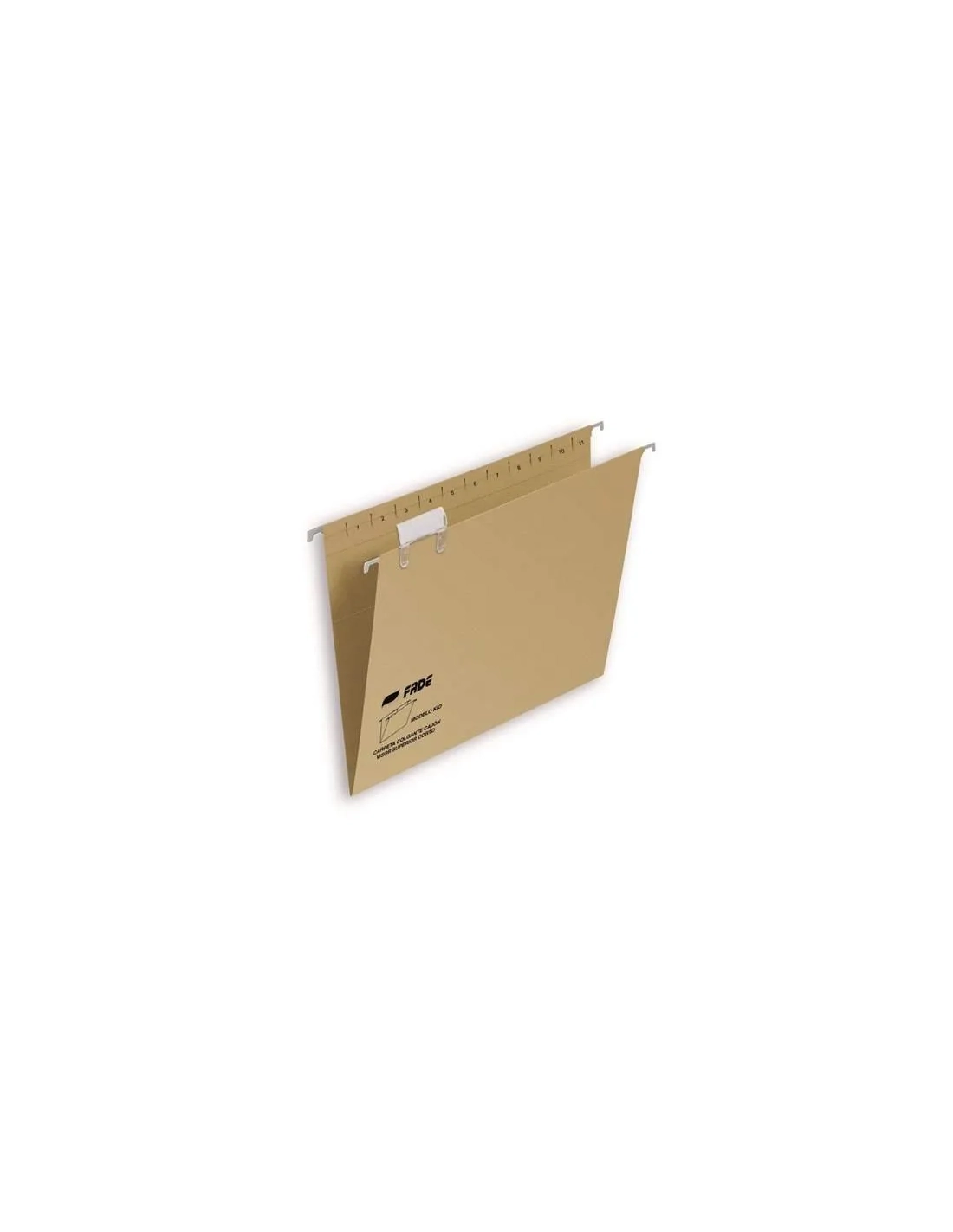 Carpetas colgantes fabricadas en Kraft reciclado de 250 g. Formato A4. Fondo normal en V. Varillas metálicas y visor corto. Medidas: 32 x 24 cm. Paquete de 50.