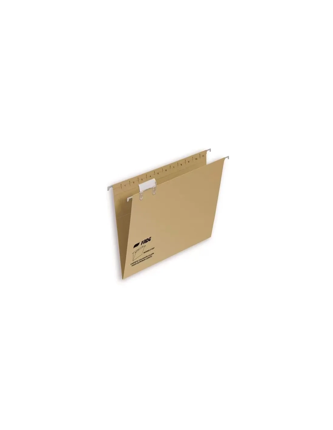 Carpetas colgantes fabricadas en Kraft reciclado de 250 g. Formato Folio. Fondo normal en V. Varillas metálicas y visor corto. Medidas: 36,5 x 24 cm. Paquete de 50.Carpeta colgante económica y de gran resistencia.